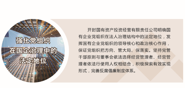 開封國投在市委市政府、市財政局的正確領導下,充分發(fā)揮領導作用,把方向、管大局、保落實,依照規(guī)定討論和決定公司重大事項。以促進公司經營發(fā)展為中心,不斷加...